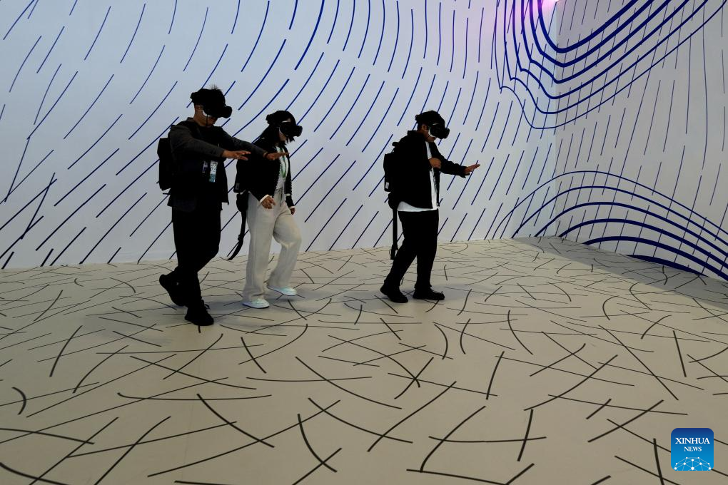 Visitors experience VR equipment at the intelligent industry and information technology exhibition zone of the 6th China International Import Expo (CIIE) in east China's Shanghai, Nov. 7, 2023. The artificial intelligence technology on display at the 6th CIIE attracted a lot of visitors. (Xinhua/Zhang Jiansong)