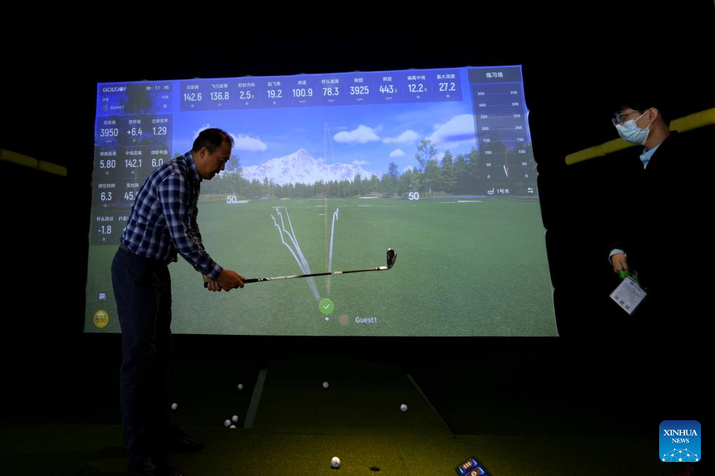 A visitor experiences interactive golf at the intelligent industry and information technology exhibition zone of the 6th China International Import Expo (CIIE) in east China's Shanghai, Nov. 7, 2023. The artificial intelligence technology on display at the 6th CIIE attracted a lot of visitors. (Xinhua/Zhang Jiansong)
