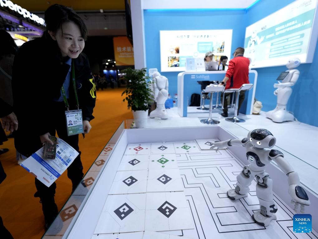 A visitor interacts with a robot of SoftBank Group at the intelligent industry and information technology exhibition zone of the 6th China International Import Expo (CIIE) in east China's Shanghai, Nov. 7, 2023. The artificial intelligence technology on display at the 6th CIIE attracted a lot of visitors. (Xinhua/Zhang Jiansong)