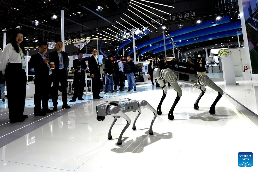 Visitors watch the performance of Hexagon robot dogs at the intelligent industry and information technology exhibition zone of the 6th China International Import Expo (CIIE) in east China's Shanghai, Nov. 7, 2023. The artificial intelligence technology on display at the 6th CIIE attracted a lot of visitors. (Xinhua/Zhang Jiansong)