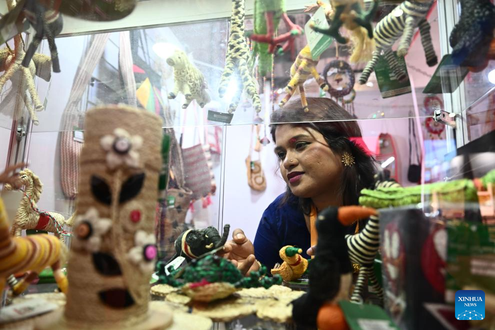 Tahera Toma, Nurus Safa's wife, arranges products at their booth during the 6th China International Import Expo (CIIE) in east China's Shanghai, Nov. 7, 2023. In 2018, Nurus Safa, founder of Dada Bangla Limited, participated in the expo for the first time, and his special products such as jute carpets, baskets and bags went popular at the time. During the past years, Safa's business has grown bigger and brought thousands of job opportunities to Bangladeshi families. (Xinhua/Jin Liangkuai)
