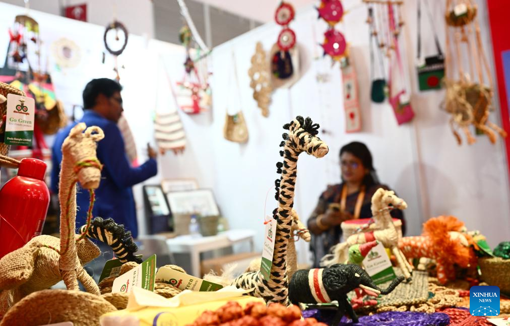 Tahera Toma, Nurus Safa's wife, introduces products at their booth during the 6th China International Import Expo (CIIE) in east China's Shanghai, Nov. 7, 2023. In 2018, Nurus Safa, founder of Dada Bangla Limited, participated in the expo for the first time, and his special products such as jute carpets, baskets and bags went popular at the time. During the past years, Safa's business has grown bigger and brought thousands of job opportunities to Bangladeshi families. (Xinhua/Jin Liangkuai)