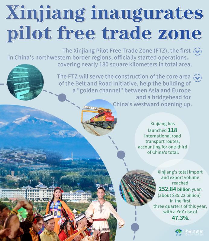 The Xinjiang Pilot Free Trade Zone, the first in China's northwestern border regions, will serve the construction of the core area of the Belt and Road lnitiative, help the building of a "golden channel" between Asia and Europe and a bridgehead for China's westward opening up.