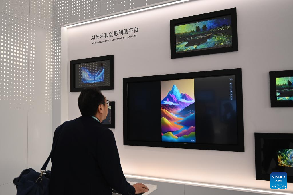 A visitor experiences creative painting by artificial intelligence (AI) at the World Internet Science and Technology Museum in Wuzhen, east China's Zhejiang Province, Nov. 7, 2023. (Xinhua/Huang Zongzhi)