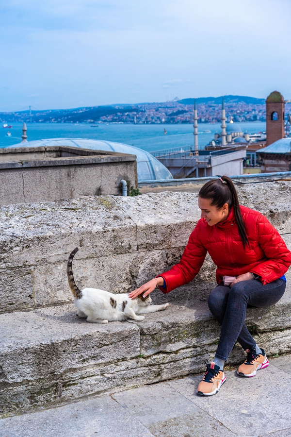 A woman plays with a cat on the street in Istanbul, Turkey. (Photo provided by the Embassy of Türkiye in China)