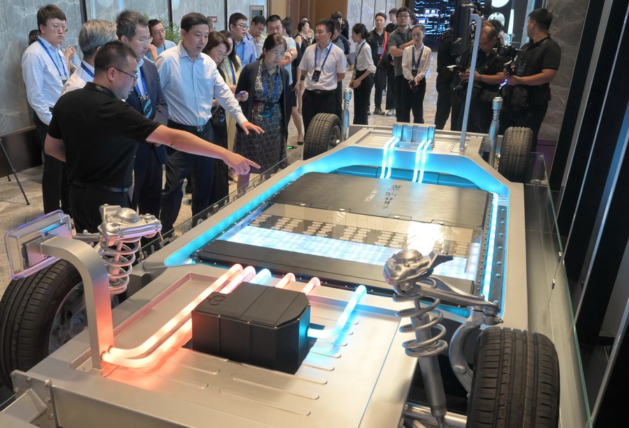 Visitors look at the Shenxing Superfast Charging Battery in Ningde, southeast China's Fujian Province, Aug. 16, 2023. (Xinhua/Lin Shanchuan)