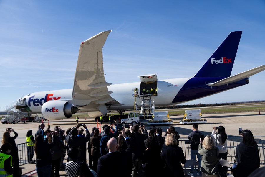 An airplane transporting giant pandas is seen at the Dulles International Airport in Dulles, Virginia, the United States, on Nov. 8, 2023. (Xinhua/Liu Jie)