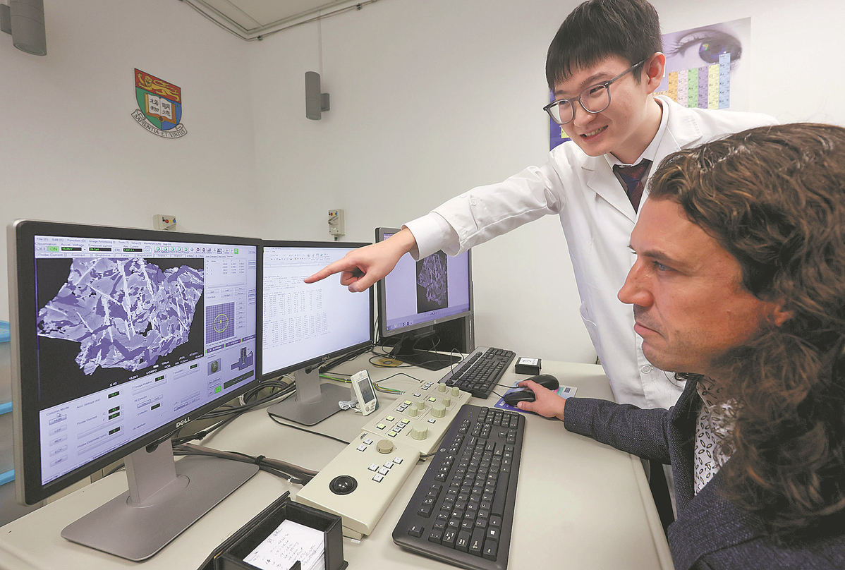 Qian and fellow geoscientist Joseph Michalski examine an image of the lunar soil. [CALVIN NG/CHINA DAILY]