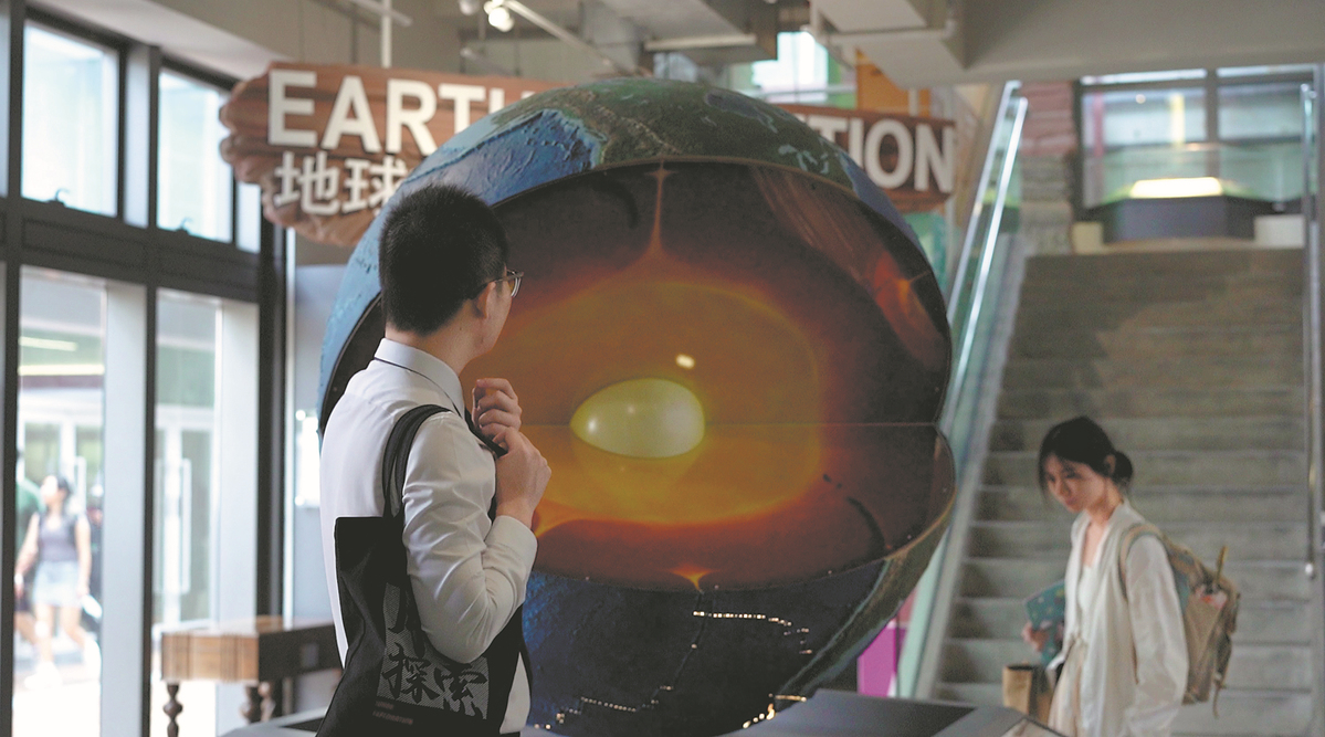 Geoscientist Qian Yuqi inspects a model of the Earth. [FLORENCE LI/CHINA DAILY]