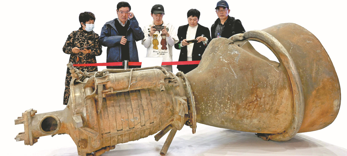Visitors to an exhibition in Hefei, Anhui province, take photographs of an engine retrieved from a Long March 2E rocket. [Photo/XINHUA]