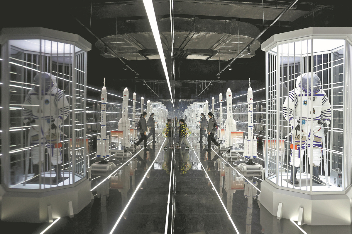 Visitors view replicas of Chinese rockets at an aerospace exhibition in Wuhan, Hubei province. [CHINA DAILY]