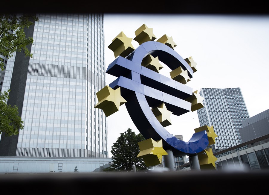 This photo taken on July 27, 2023 shows the Euro sign in Frankfurt, Germany. The European Central Bank (ECB) raised its key interest rates by 25 basis points (bps) on Thursday to curb inflation. (Xinhua/Zhang Fan)