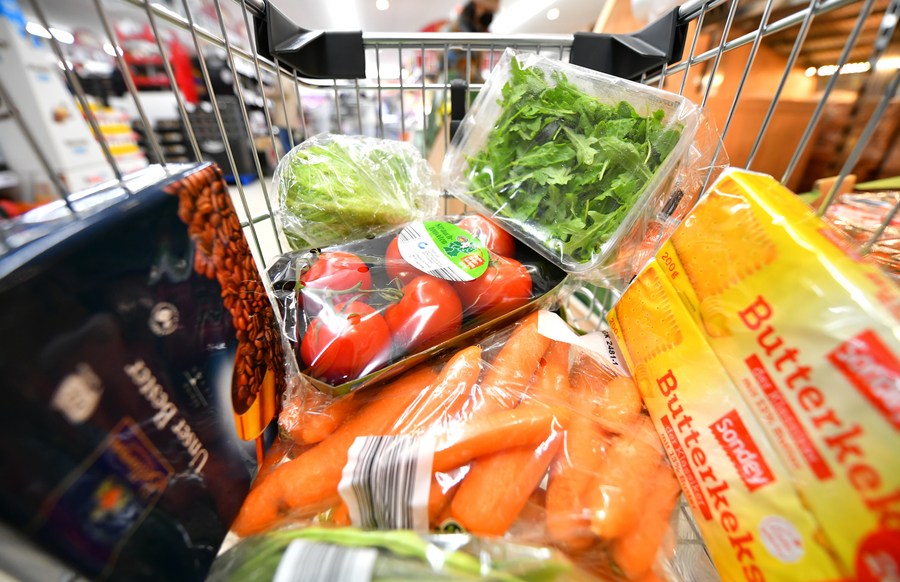 This photo taken on Nov. 11, 2022 shows goods in a shopping trolley at a supermarket in Berlin, capital of Germany. (Xinhua/Ren Pengfei)