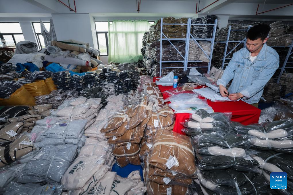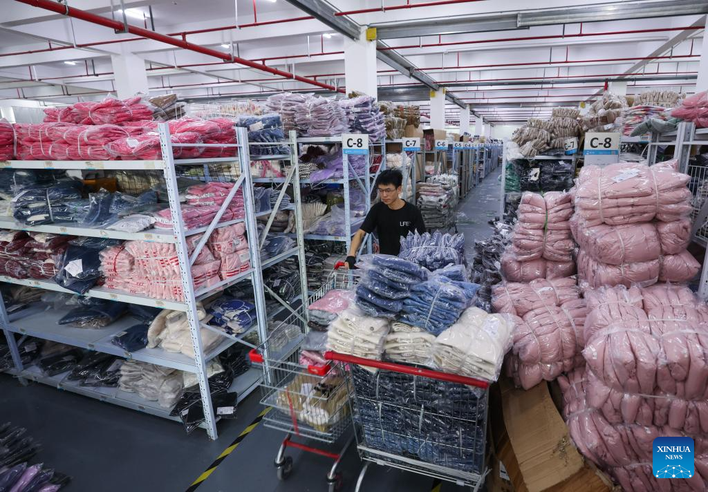 A staff member picks up children's clothing for orders in a warehouse of a garment enterprise in Zhili Town of Huzhou City in east China's Zhejiang Province, Nov. 8, 2023. The 10,000-plus children's garment enterprises in Zhili Town have beefed up productivity and business promotion as China's "Double Eleven" online shopping festival is approaching. (Xinhua/Xu Yu)