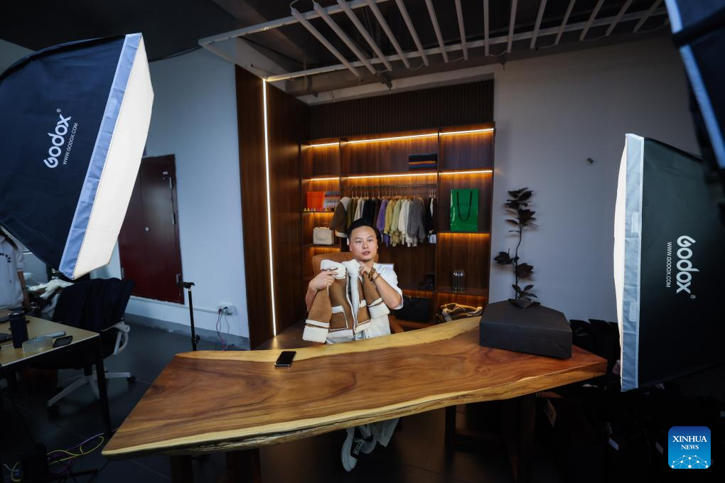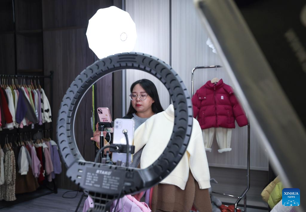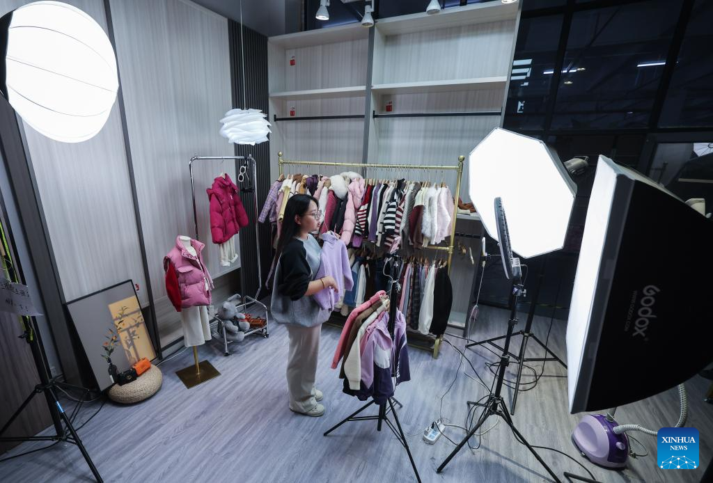 You Heng, person in charge of a garment enterprise, promotes children's clothing via livestreaming in Zhili Town of Huzhou City in east China's Zhejiang Province, Nov. 8, 2023. The 10,000-plus children's garment enterprises in Zhili Town have beefed up productivity and business promotion as China's "Double Eleven" online shopping festival is approaching. (Xinhua/Xu Yu)