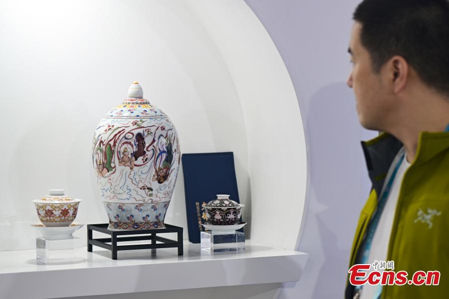 A visitor views Jingdezhen porcelain artworks at the 6th China International Import Expo (CIIE) in Shanghai, Nov. 7, 2023. (Photo: China News Service/Tian Yuhao)