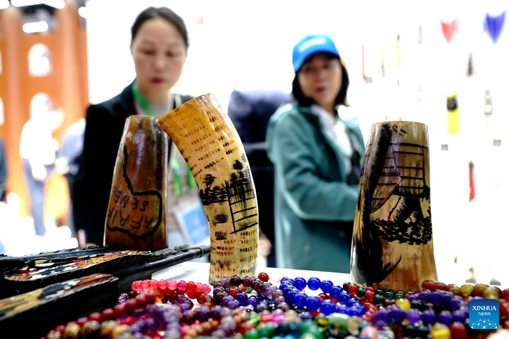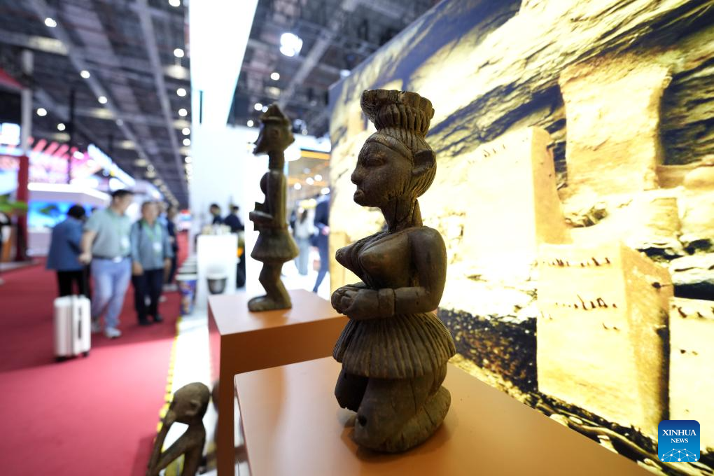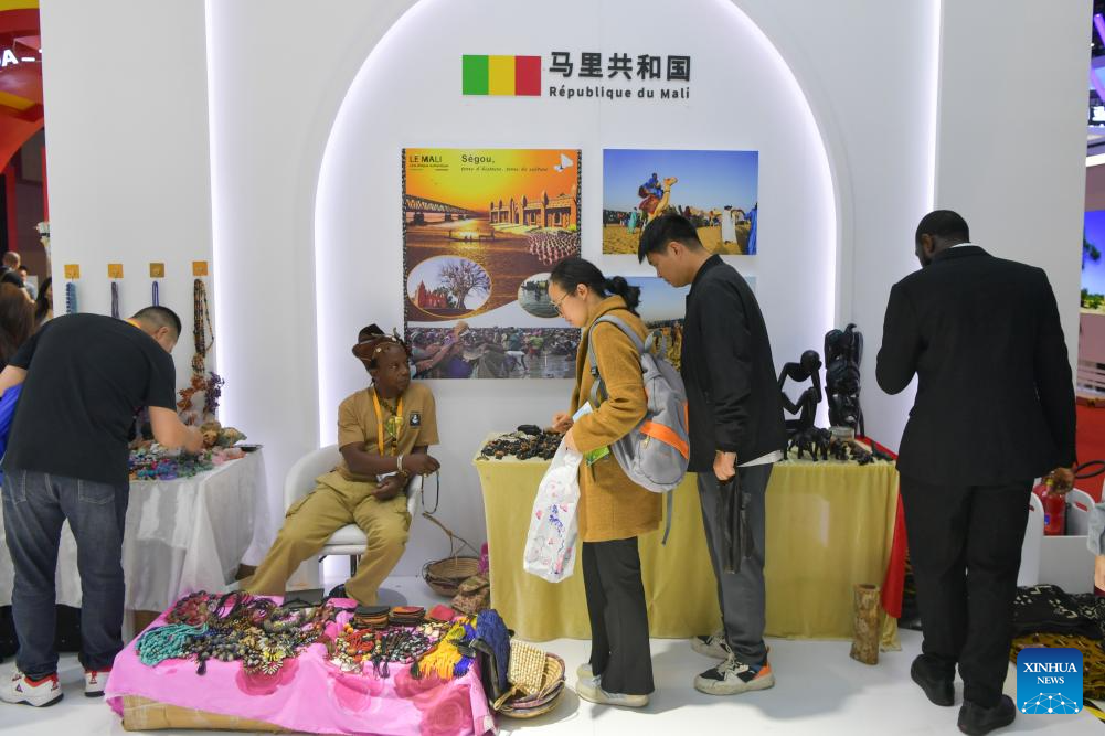People learn about handicrafts at the booth of Mali in the Country Exhibition at the 6th China International Import Expo (CIIE) in east China's Shanghai, Nov. 8, 2023. The 6th CIIE has provided free booths and other supportive policies to about 100 companies from 30 least developed countries. (Xinhua/Meng Tao)