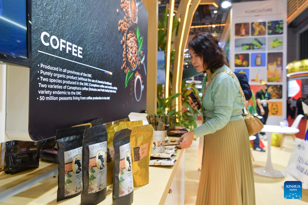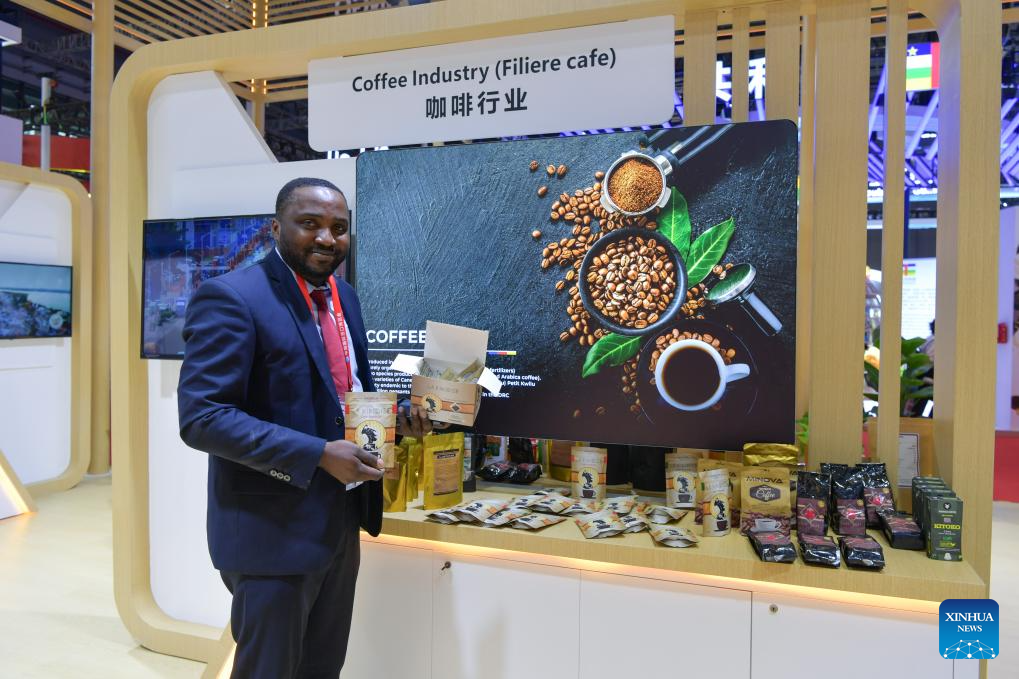 An exhibitor presents coffee products from Kinshasa at the booth of the Democratic Republic of the Congo (DRC) in the Country Exhibition at the 6th China International Import Expo (CIIE) in east China's Shanghai, Nov. 8, 2023. The 6th CIIE has provided free booths and other supportive policies to about 100 companies from 30 least developed countries. (Xinhua/Meng Tao)