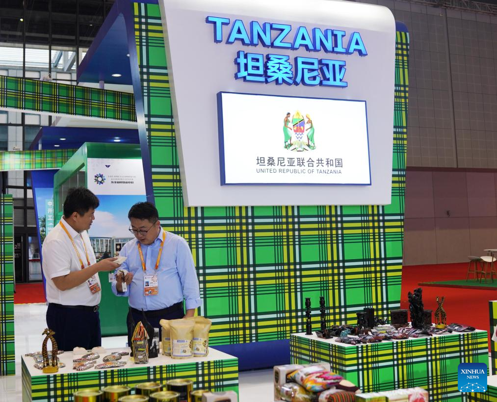 People visit the booth of Tanzania in the Country Exhibition at the 6th China International Import Expo (CIIE) in east China's Shanghai, Nov. 5, 2023. The 6th CIIE has provided free booths and other supportive policies to about 100 companies from 30 least developed countries. (Xinhua/Li Mengjiao)