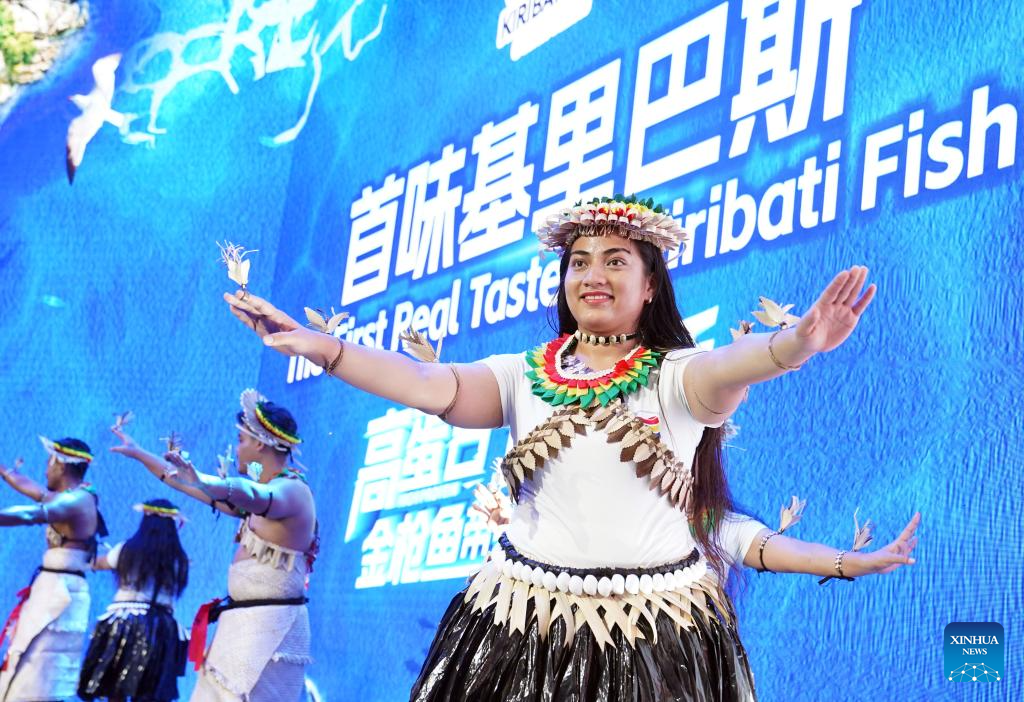 Staff members from Kiribati perform at the 6th China International Import Expo (CIIE) in east China's Shanghai, Nov. 8, 2023. The 6th CIIE has provided free booths and other supportive policies to about 100 companies from 30 least developed countries. (Xinhua/Liu Ying)