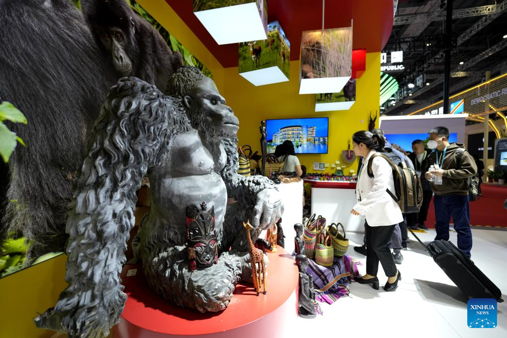 People visit the booth of Uganda in the Country Exhibition at the 6th China International Import Expo (CIIE) in east China's Shanghai, Nov. 8, 2023. The 6th CIIE has provided free booths and other supportive policies to about 100 companies from 30 least developed countries. (Xinhua/Zhang Jiansong)