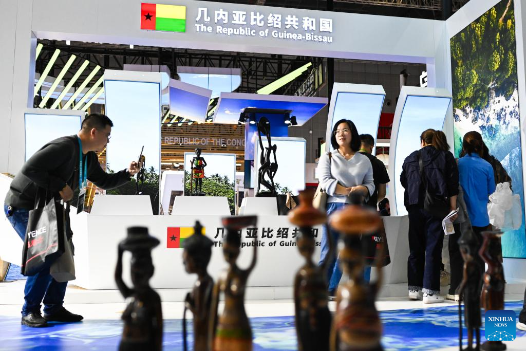 A man takes photos at the booth of Guinea-Bissau in the Country Exhibition at the 6th China International Import Expo (CIIE) in east China's Shanghai, Nov. 8, 2023. The 6th CIIE has provided free booths and other supportive policies to about 100 companies from 30 least developed countries. (Xinhua/Zhang Keren)