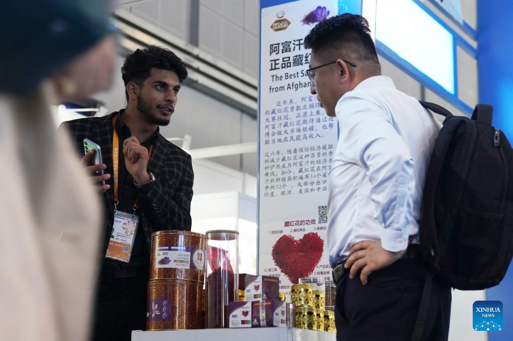 A visitor learns about saffron from Afghanistan at the 6th China International Import Expo (CIIE) in east China's Shanghai, Nov. 8, 2023. The 6th CIIE has provided free booths and other supportive policies to about 100 companies from 30 least developed countries. (Xinhua/Li Mengjiao)