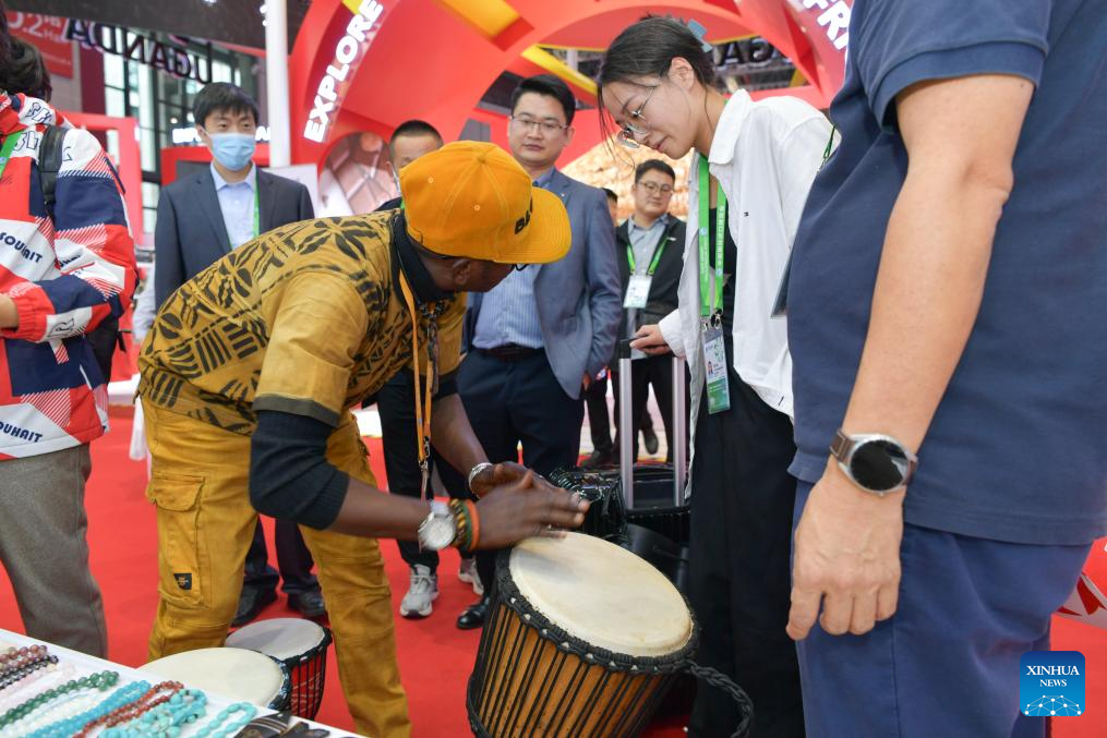An exhibitor demonstrates as he presents African drum at the booth of Mali in the Country Exhibition at the 6th China International Import Expo (CIIE) in east China's Shanghai, Nov. 8, 2023. The 6th CIIE has provided free booths and other supportive policies to about 100 companies from 30 least developed countries. (Xinhua/Meng Tao)