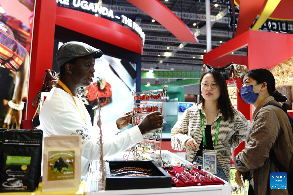 An exhibitor presents jewelry at the booth of Uganda in the Country Exhibition at the 6th China International Import Expo (CIIE) in east China's Shanghai, Nov. 8, 2023. The 6th CIIE has provided free booths and other supportive policies to about 100 companies from 30 least developed countries. (Xinhua/Zhang Jiansong)