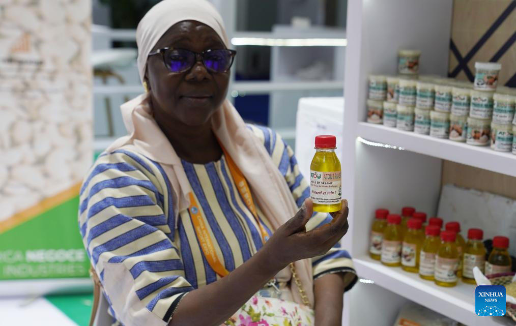 An exhibitor displays a sesame oil product from Mali at the 6th China International Import Expo (CIIE) in east China's Shanghai, Nov. 5, 2023. The 6th CIIE has provided free booths and other supportive policies to about 100 companies from 30 least developed countries.
