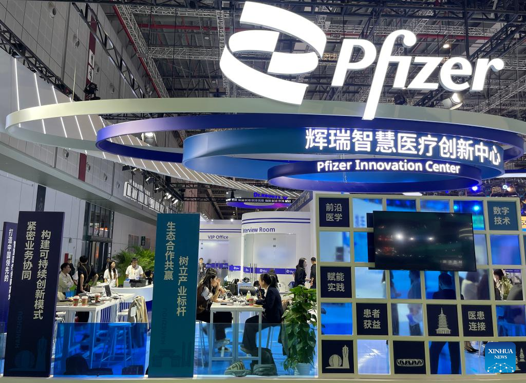 This photo shows the Pfizer booth at the 6th China International Import Expo (CIIE) in east China's Shanghai, Nov. 8, 2023. The 6th China International Import Expo (CIIE), which has attracted over 3,400 exhibitors globally, showcases China's new development paradigm and builds a broad platform for global business to gain more opportunities in the world's most promising market. (Xinhua/Li Mengjiao)