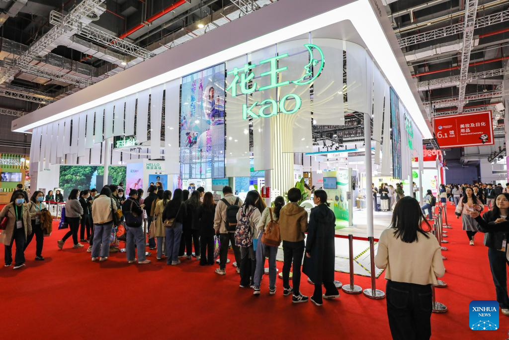 People visit the Kao booth at the 6th China International Import Expo (CIIE) in east China's Shanghai, Nov. 7, 2023. The 6th China International Import Expo (CIIE), which has attracted over 3,400 exhibitors globally, showcases China's new development paradigm and builds a broad platform for global business to gain more opportunities in the world's most promising market. (Xinhua/Xin Mengchen)