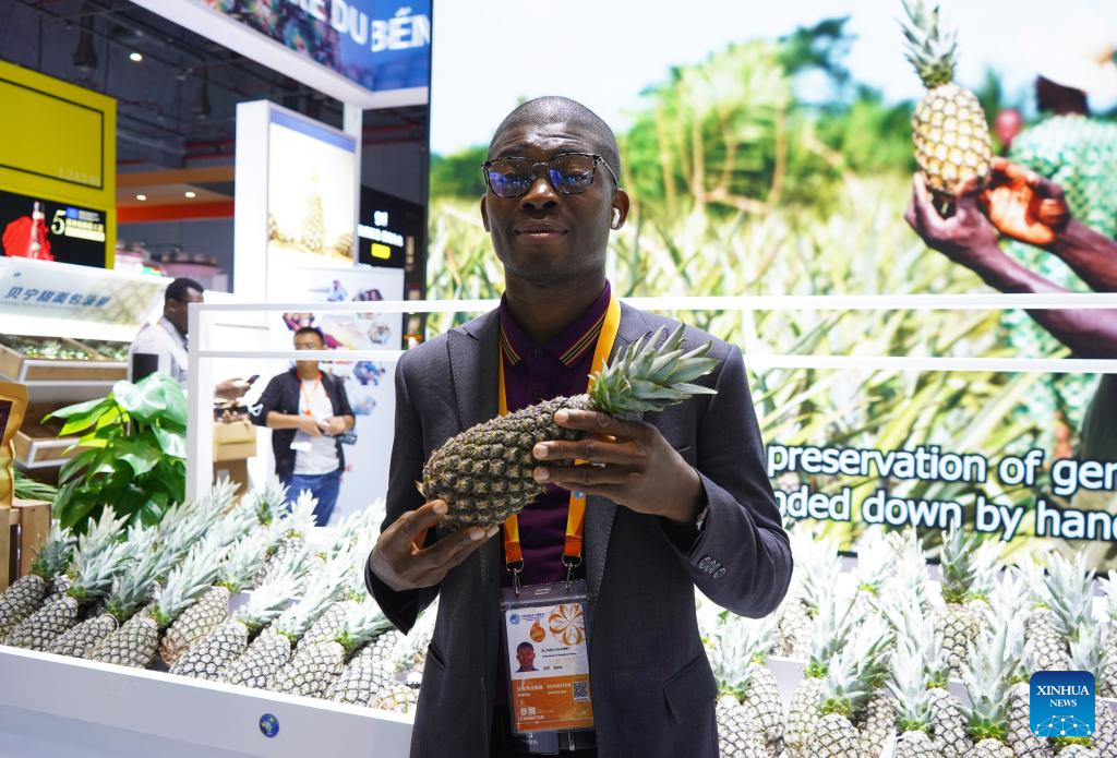 A staff worker shows a pineapple from Benin at the 6th China International Import Expo (CIIE) in east China's Shanghai, Nov. 8, 2023. The 6th China International Import Expo (CIIE), which has attracted over 3,400 exhibitors globally, showcases China's new development paradigm and builds a broad platform for global business to gain more opportunities in the world's most promising market. (Xinhua/Jin Haoyuan)