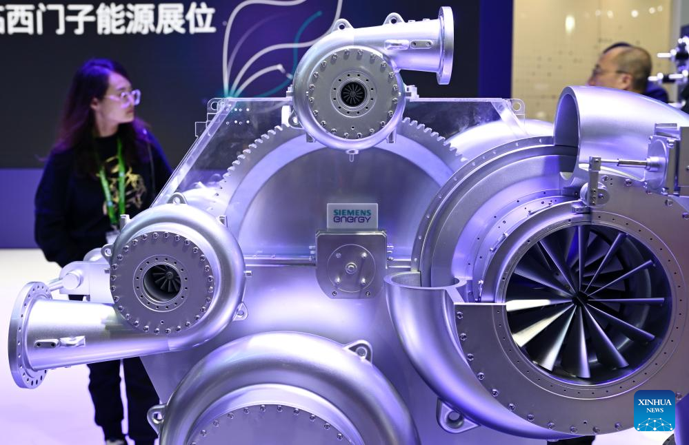 Visitors look at an exhibit at the Siemens Energy booth at the 6th China International Import Expo (CIIE) in east China's Shanghai, Nov. 7, 2023. The 6th China International Import Expo (CIIE), which has attracted over 3,400 exhibitors globally, showcases China's new development paradigm and builds a broad platform for global business to gain more opportunities in the world's most promising market. (Xinhua/Jin Liangkuai)
