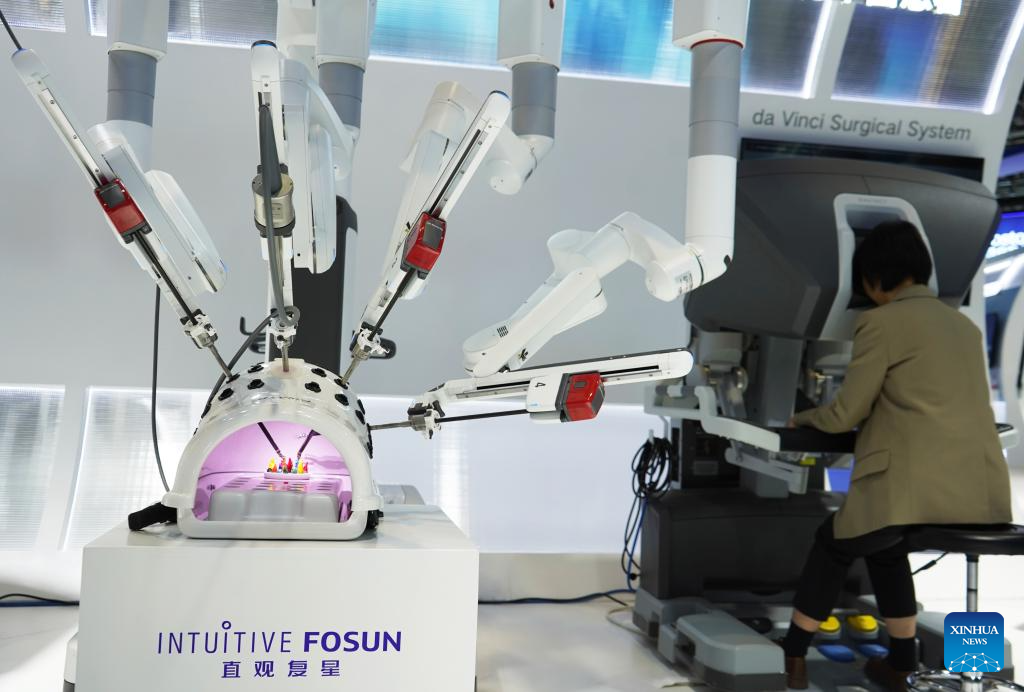 A staff worker demonstrates the operation of the domestic da Vinci Surgical System at the 6th China International Import Expo (CIIE) in east China's Shanghai, Nov. 7, 2023. The 6th China International Import Expo (CIIE), which has attracted over 3,400 exhibitors globally, showcases China's new development paradigm and builds a broad platform for global business to gain more opportunities in the world's most promising market. (Xinhua/Jin Haoyuan)