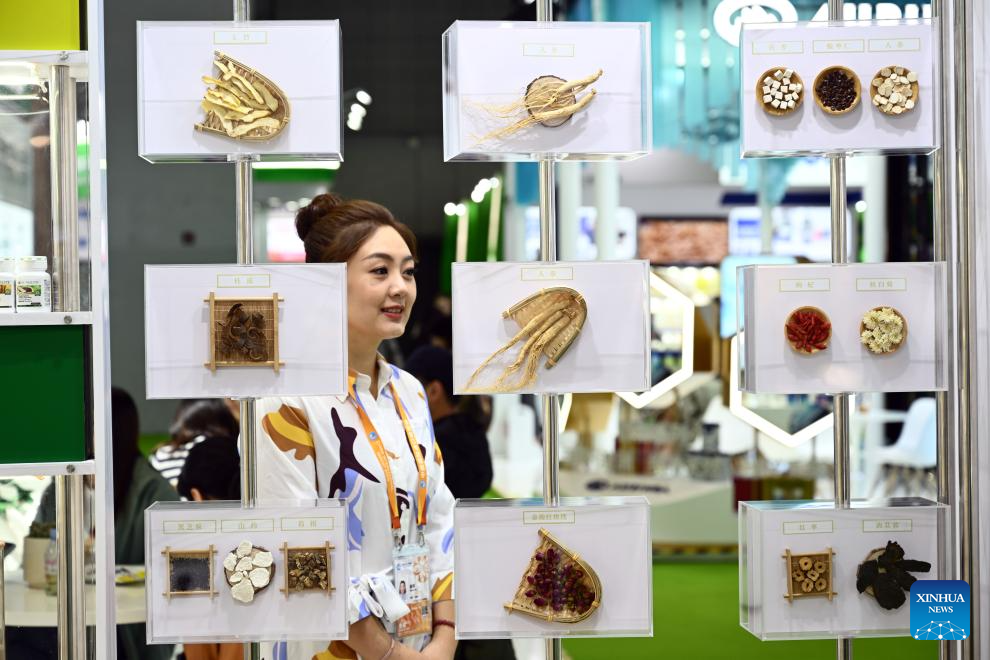 This photo shows Chinese herbs at the Amway booth at the 6th China International Import Expo (CIIE) in east China's Shanghai, Nov. 7, 2023. The 6th China International Import Expo (CIIE), which has attracted over 3,400 exhibitors globally, showcases China's new development paradigm and builds a broad platform for global business to gain more opportunities in the world's most promising market. (Xinhua/Jin Liangkuai)