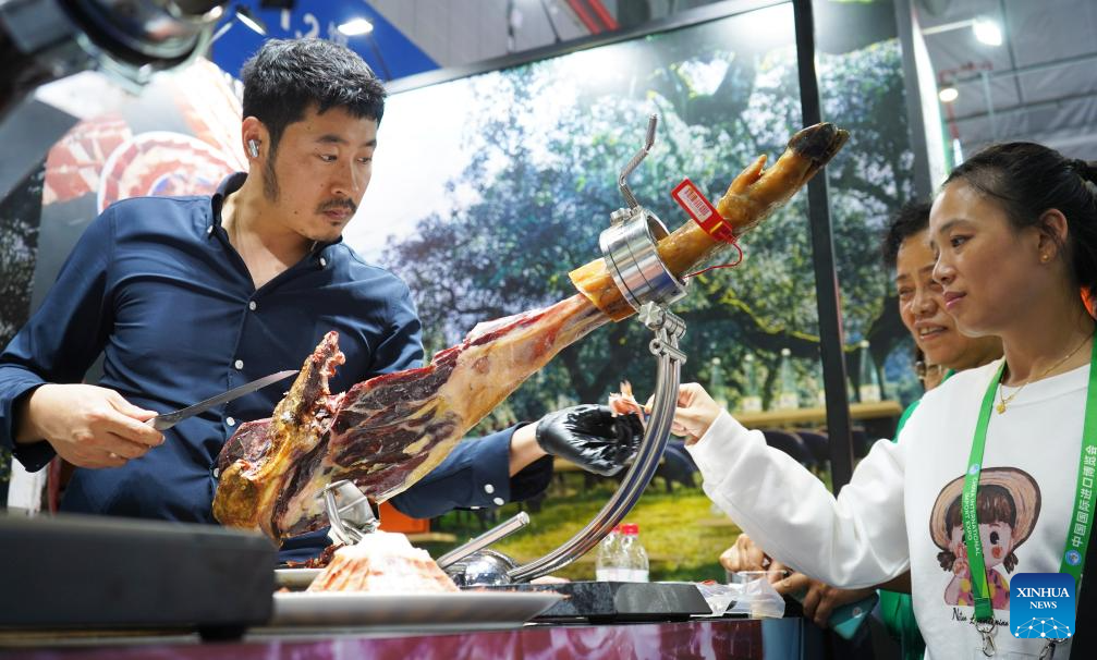 Visitors queue to taste Spanish Iberian ham at the 6th China International Import Expo (CIIE) in east China's Shanghai, Nov. 8, 2023. The 6th China International Import Expo (CIIE), which has attracted over 3,400 exhibitors globally, showcases China's new development paradigm and builds a broad platform for global business to gain more opportunities in the world's most promising market. (Xinhua/Jin Haoyuan)
