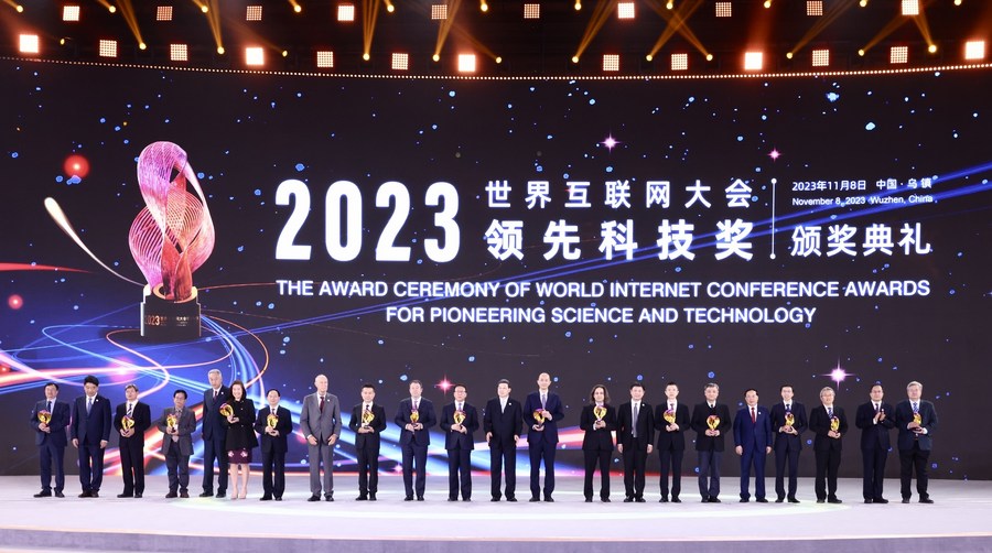 Representatives of award-winning projects pose for photos during the award ceremony of World Internet Conference Awards for Pioneering Science and Technology in Wuzhen, east China's Zhejiang Province, Nov. 8, 2023. (Xinhua/Zhang Yuwei)