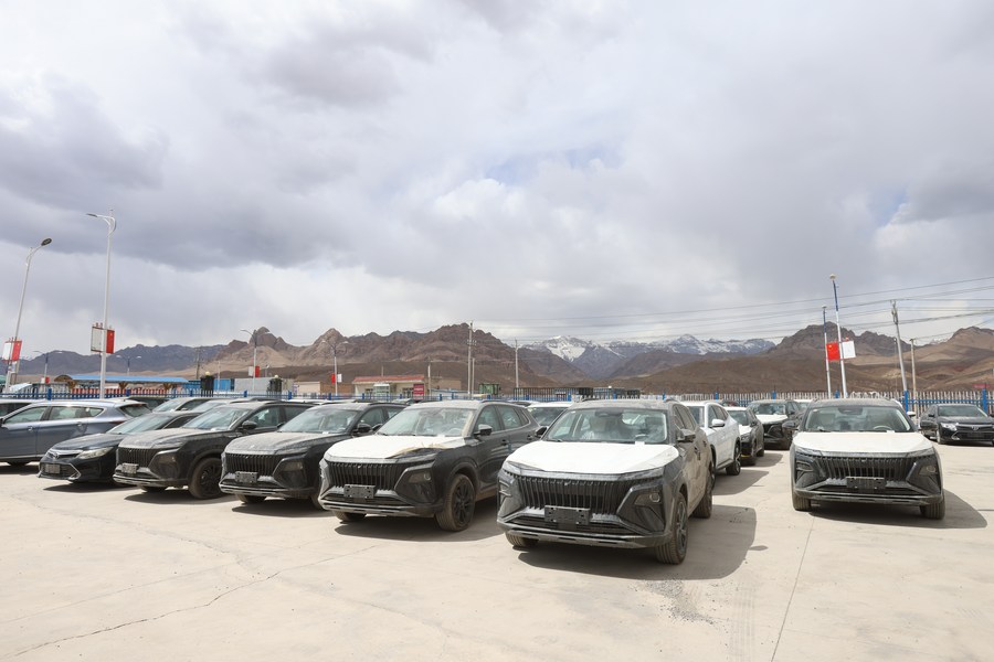 This photo taken on April 25, 2023 shows vehicles to be exported at the Irkeshtam port in the Kizilsu Kirgiz Autonomous Prefecture, northwest China's Xinjiang Uygur Autonomous Region. (Xinhua/Hao Zhao)