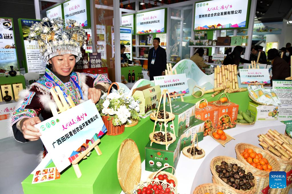An exhibitor from Guangxi makes preparations for her booth at the 20th China International Agricultural Trade Fair in Qingdao, east China's Shandong Province, Nov. 9, 2023. The 20th China International Agricultural Trade Fair kicked off Thursday in Qingdao with around 3,000 exhibitors attending the fair. (Xinhua/Li Ziheng)