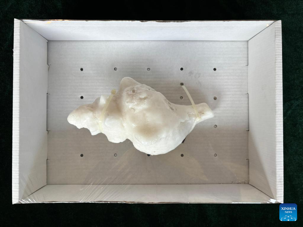 This photo taken on Nov. 6, 2023 shows the suspected methamphetamine camouflaged as a seashell detected by Hong Kong Customs in Hong Kong, south China. (Xinhua)