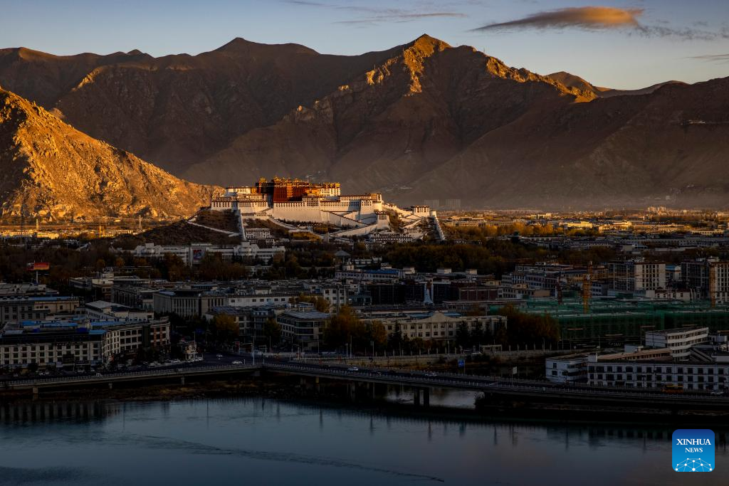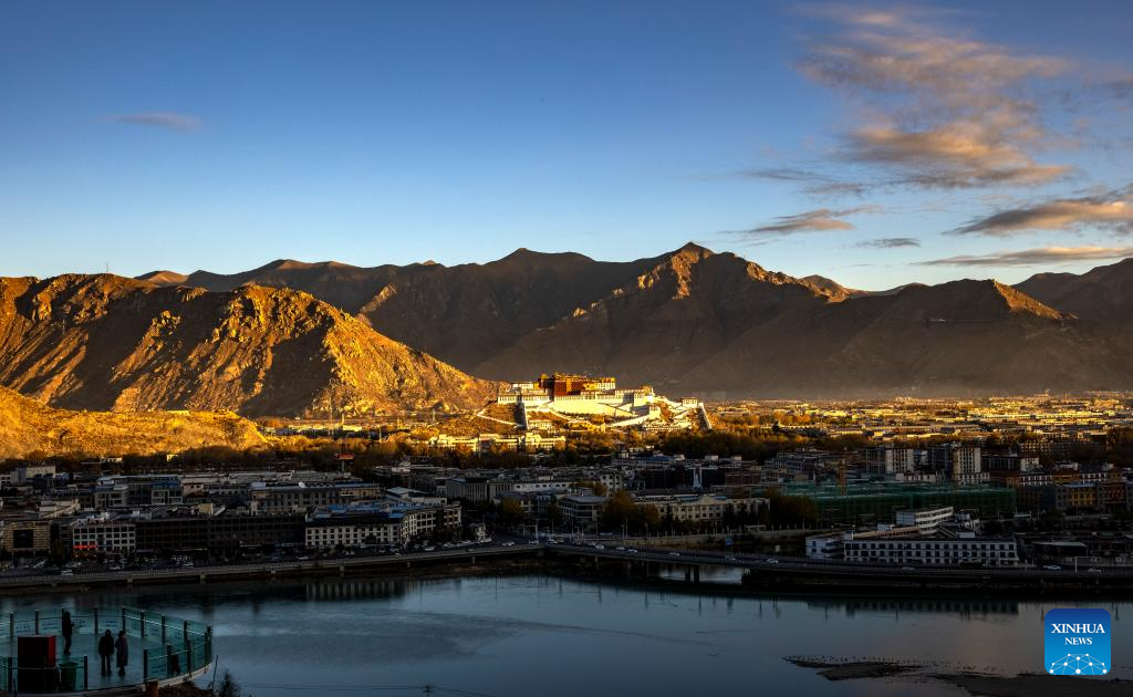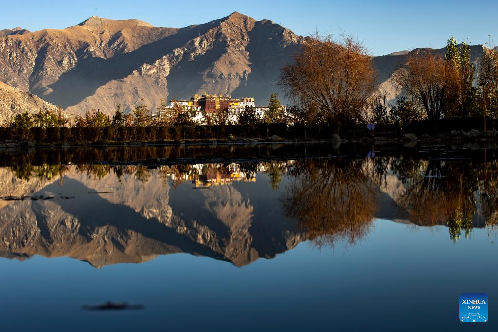 This photo taken on Nov. 10, 2023 shows the Potala Palace seen from Nanshan Park in Lhasa, capital of southwest China's Xizang Autonomous Region. (Xinhua/Jiang Fan)