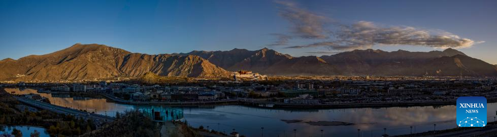 This stitched photo taken on Nov. 10, 2023 shows the city view seen from Nanshan Park in Lhasa, capital of southwest China's Xizang Autonomous Region. (Xinhua/Jiang Fan)