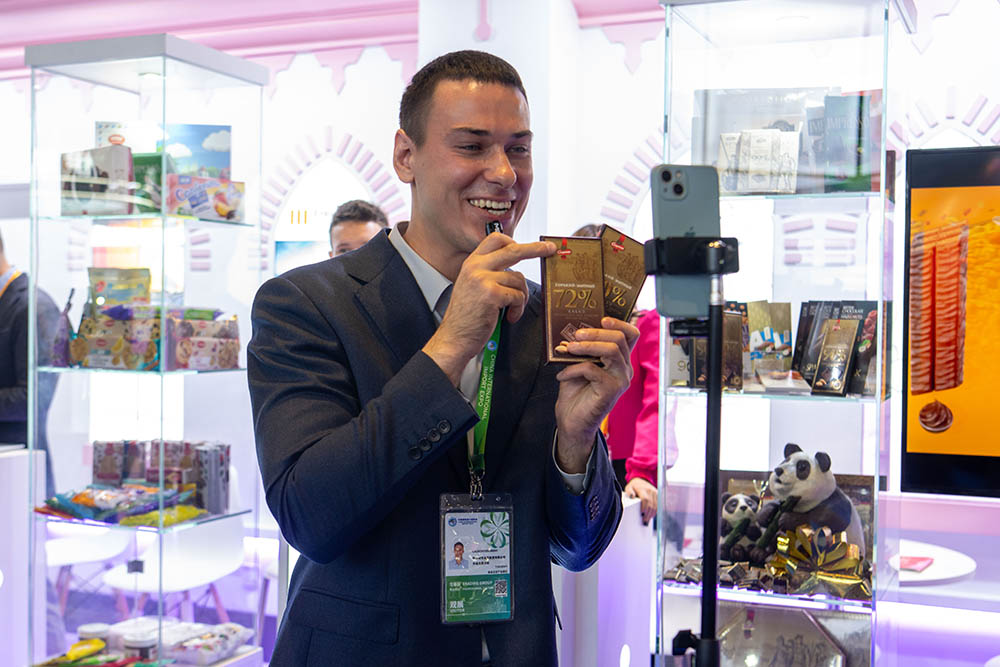 An exhibitor introduces chocolates from Belarus at the food and agricultural products exhibition area of the sixth China International Import Expo (CIIE) in Shanghai. (People's Daily Online/Weng Qiyu)