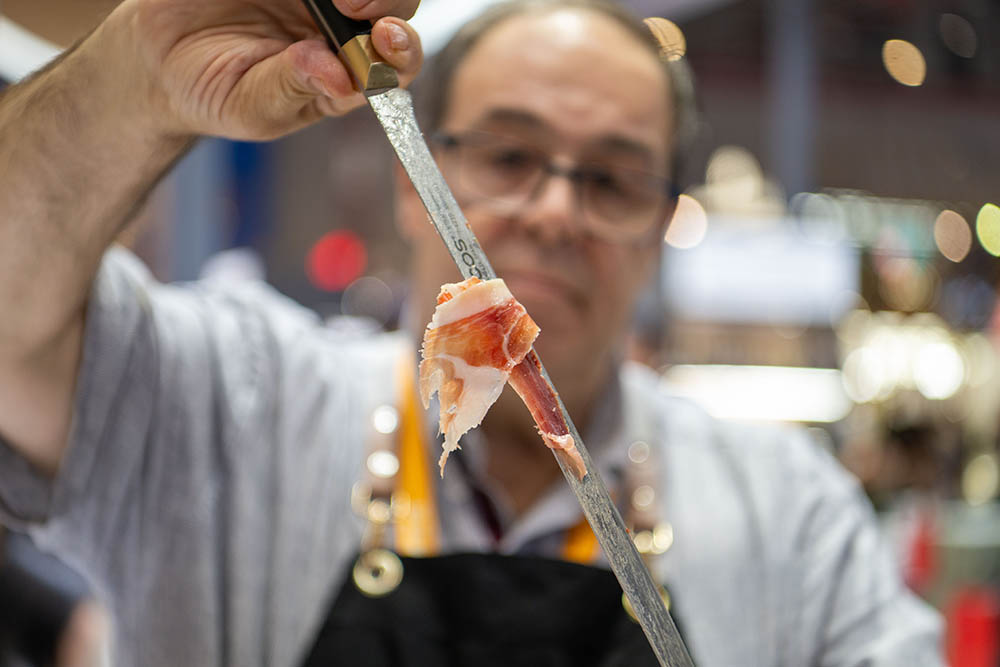 An exhibitor shows a slice of Iberian ham from Spain in the food and agricultural products exhibition area of the sixth China International Import Expo (CIIE) in Shanghai. (People's Daily Online/Weng Qiyu)