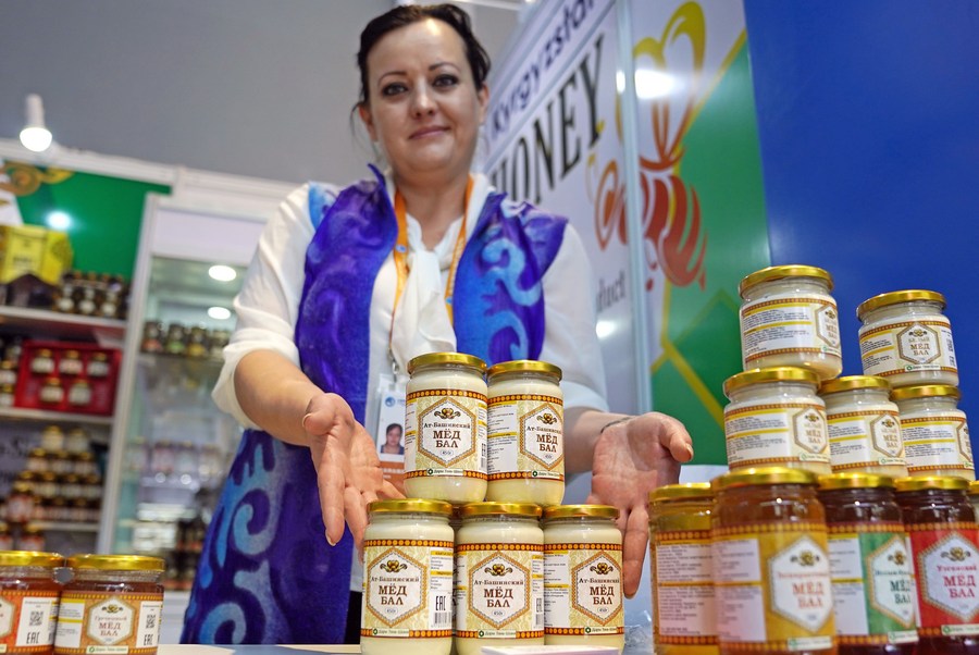 An exhibitor displays honey products from Kyrgyzstan at the 6th China International Import Expo (CIIE) in east China's Shanghai, Nov. 7, 2023. (Xinhua/Liu Ying)