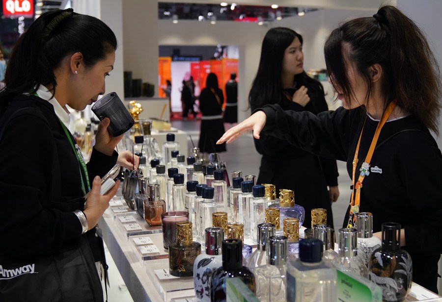 A visitor smells a Belgian candle at the 6th China International Import Expo (CIIE) in east China's Shanghai, Nov. 9, 2023. (Xinhua/Li Mengjiao)
