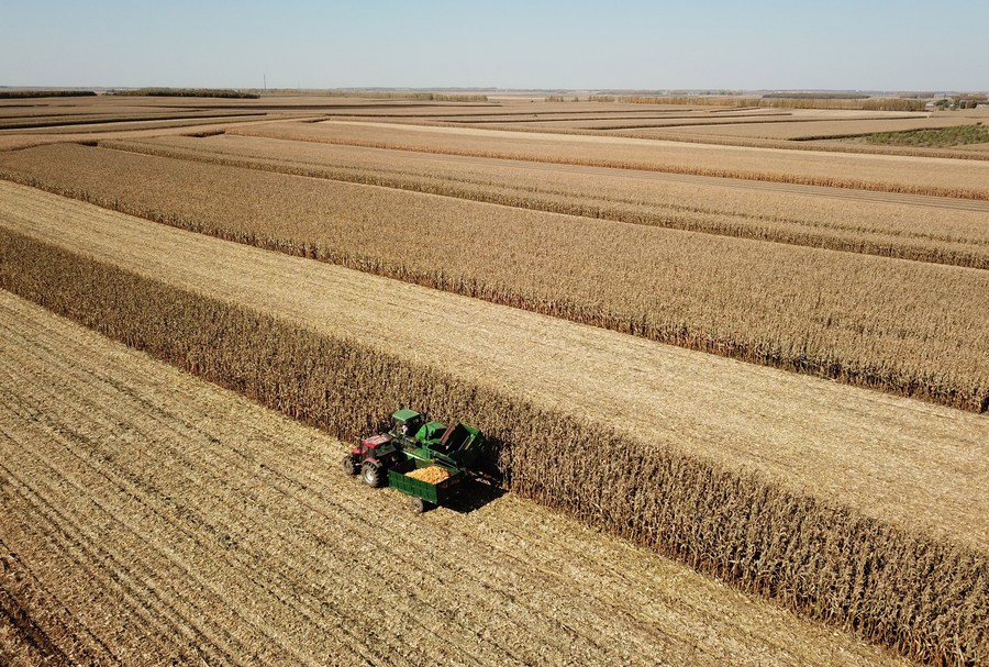 This aerial photo taken on Oct. 11, 2023 shows agricultural machines harvesting corns in Fujin City, northeast China's Heilongjiang Province. (Xinhua/Wang Jianwei)