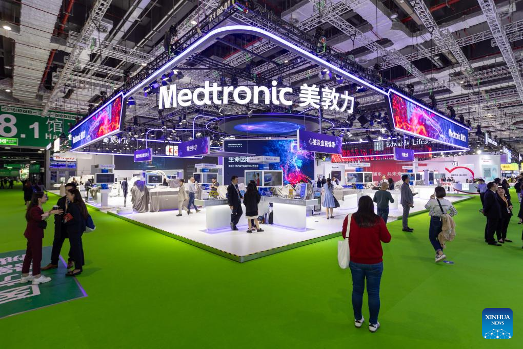 This photo taken on Nov. 8, 2023 shows a booth of Medtronic at the 6th China International Import Expo (CIIE) in east China's Shanghai. (Xinhua/Wang Xiang)