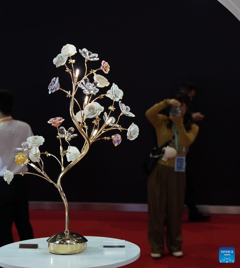 A visitor takes pictures of a table lamp displayed at the booth of Jewelry company EJI during the 6th China International Import Expo (CIIE) in east China's Shanghai, Nov. 9, 2023. (Xinhua/Li Mengjiao)